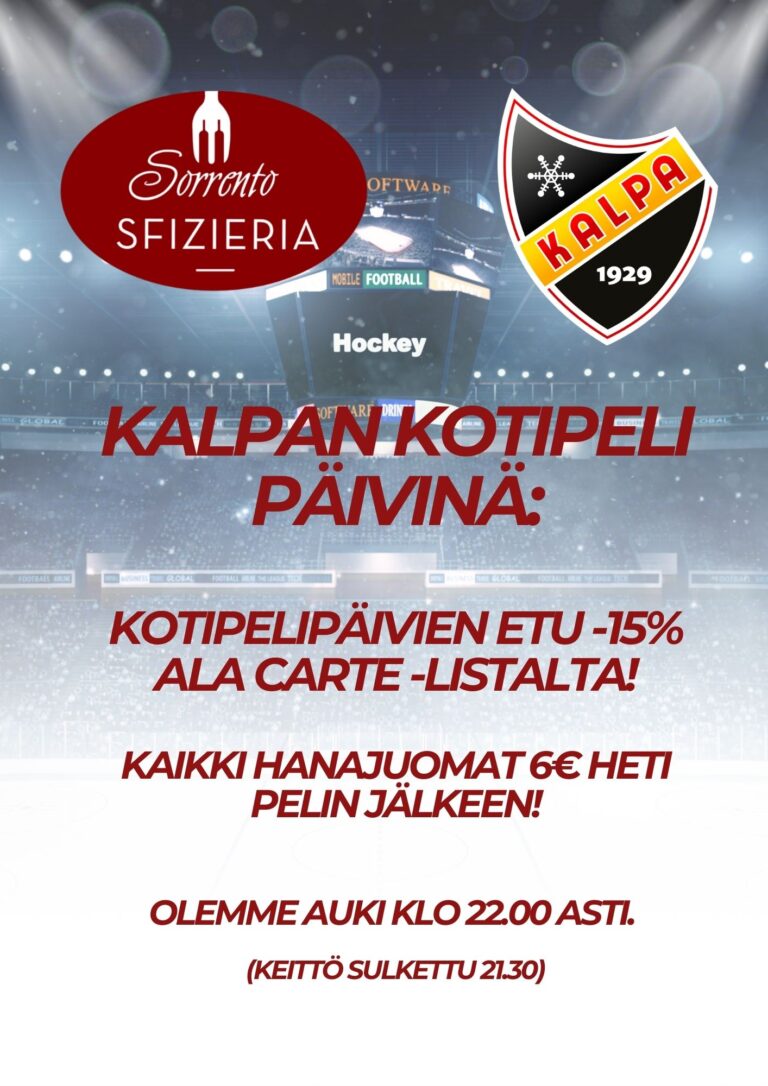Kalpan & KUPSin pelipäivinä lippua peliin tai kausikorttia näyttämällä -15% ala carte -listaltamme!